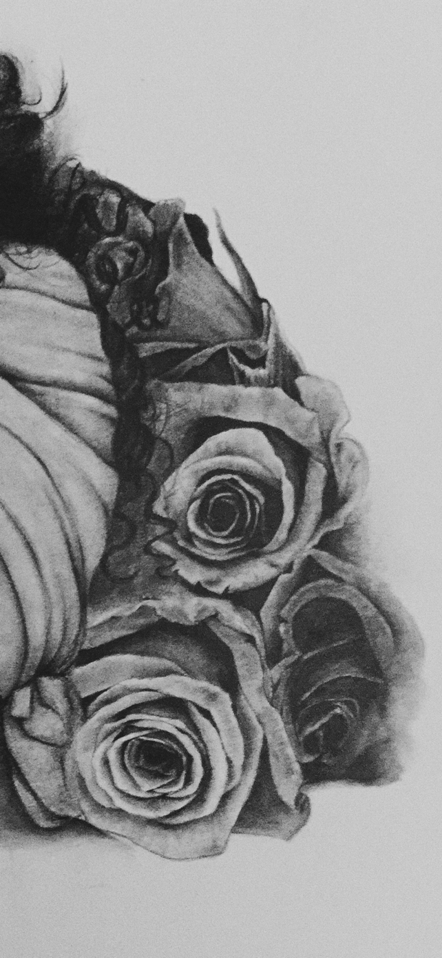 Realistic drawing featuring an arrangement of roses acting as a backdrop for the portrait